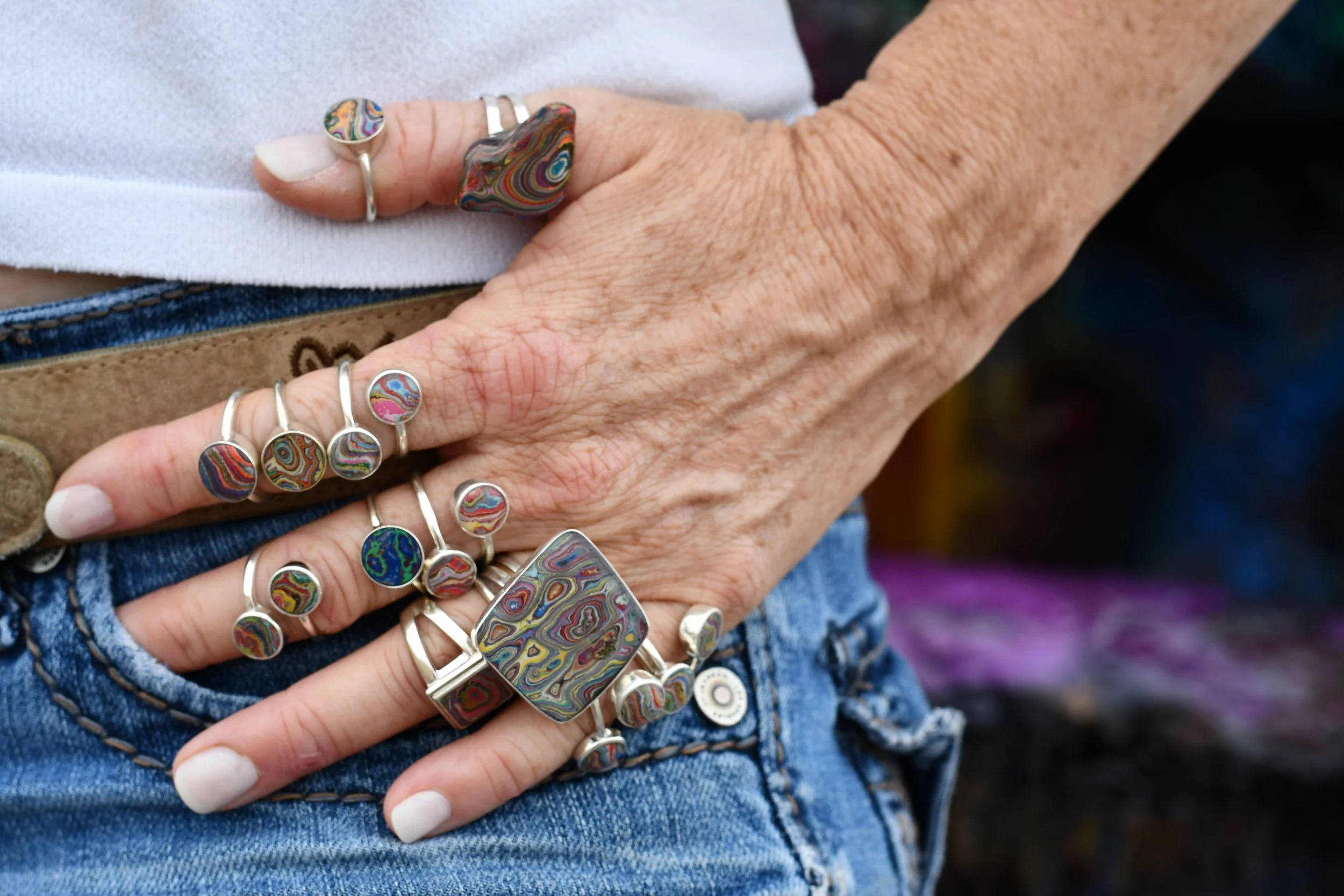 The sterling necklaces, rings, earrings, and charms on our website are handcrafted from authentic, responsibly-sourced paint chips from Cadillac Ranch, refined to reveal layers of color and set in .925 sterling silver. The end result is a distinctive, one-of-a-kind piece of wearable art.