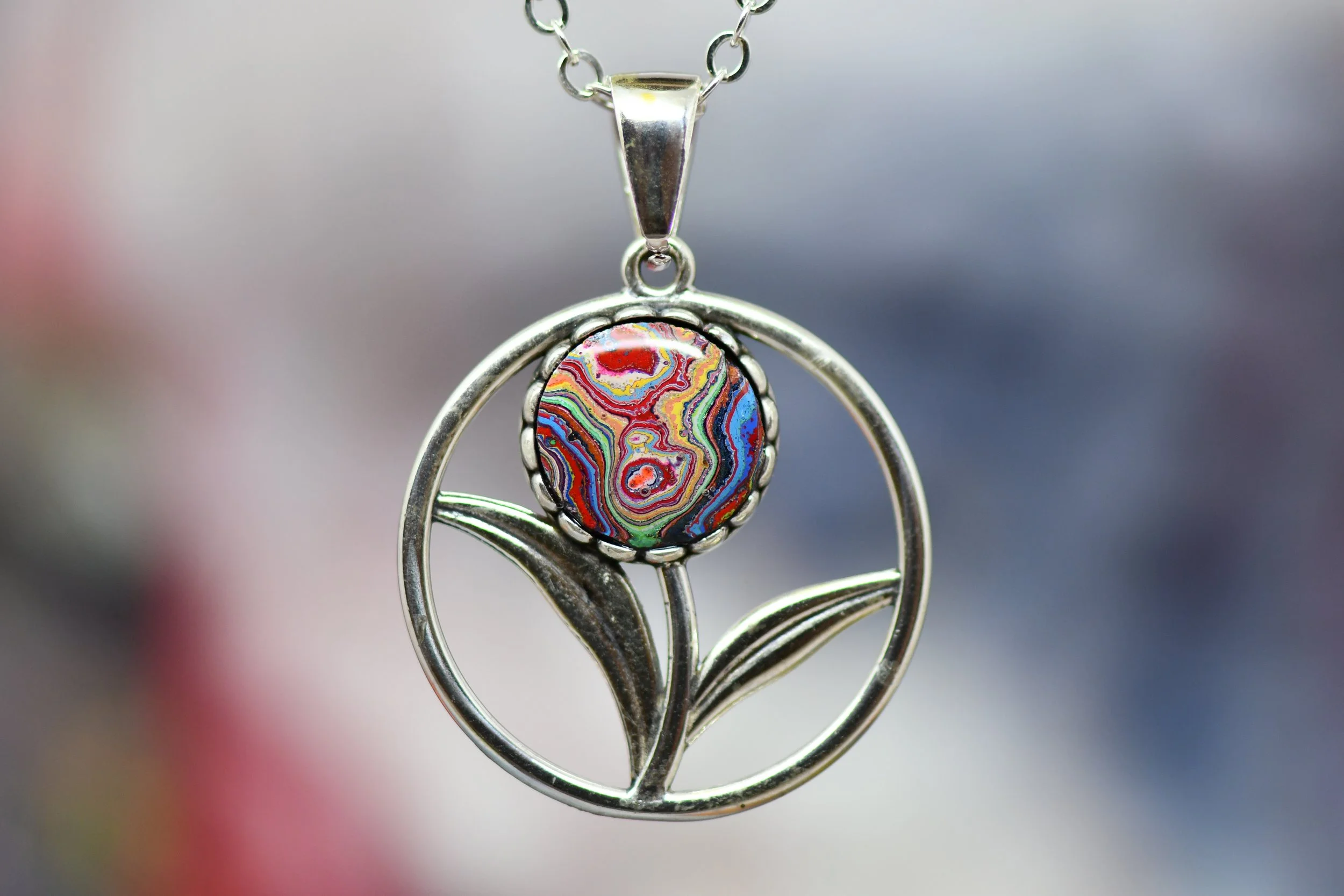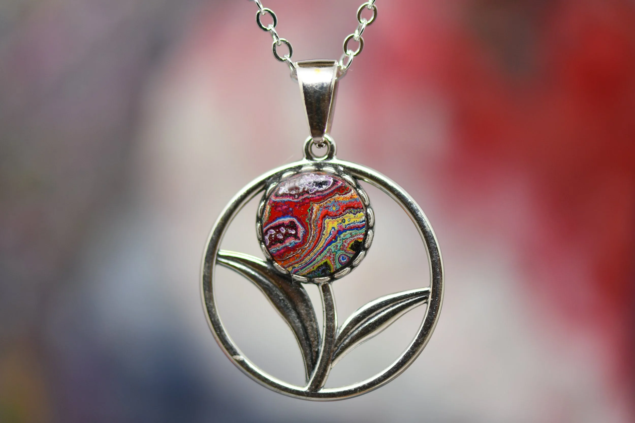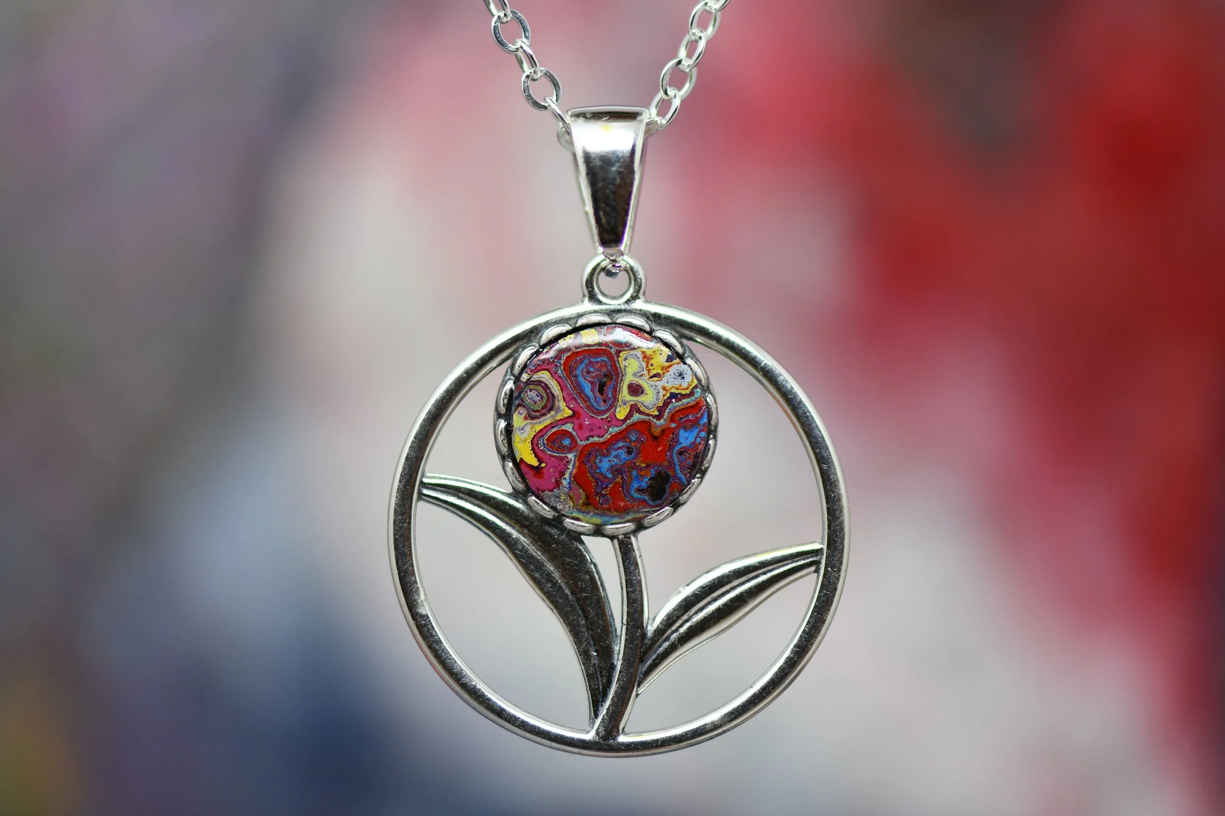 Measurements and Sizing: Pendant: 24mm diameter; Bezel and paint: 10mm in diameter; 18" sterling silver chain.
